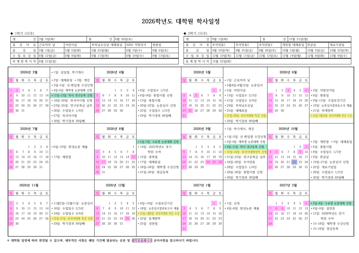 2026학년도 대학원 학사일정 확정 및 알림